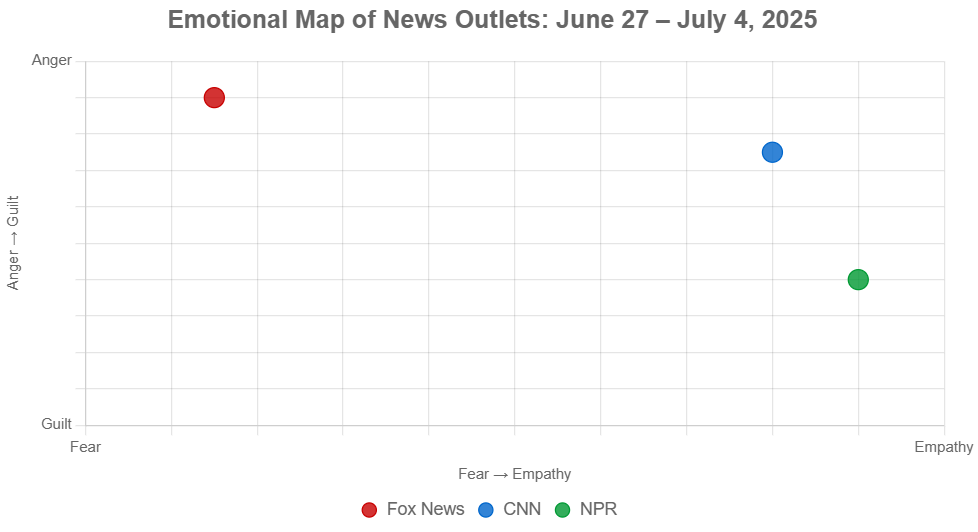 Beth: This week’s media analysis reveals a powerful emotional divide in how Fox News, CNN, and NPR are framing the same national events. Though the core topics—tariffs, immigration, legal battles, and cultural tensions—remain largely consistent across the outlets, the emotional tones and intended impact diverge dramatically.