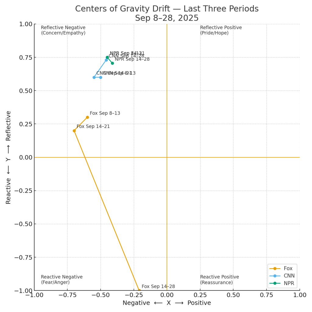 We scan Fox News, CNN, and NPR for the period Sep 14–28, 2025, pull their top stories, and score each outlet’s emotional framing using our quadrant: