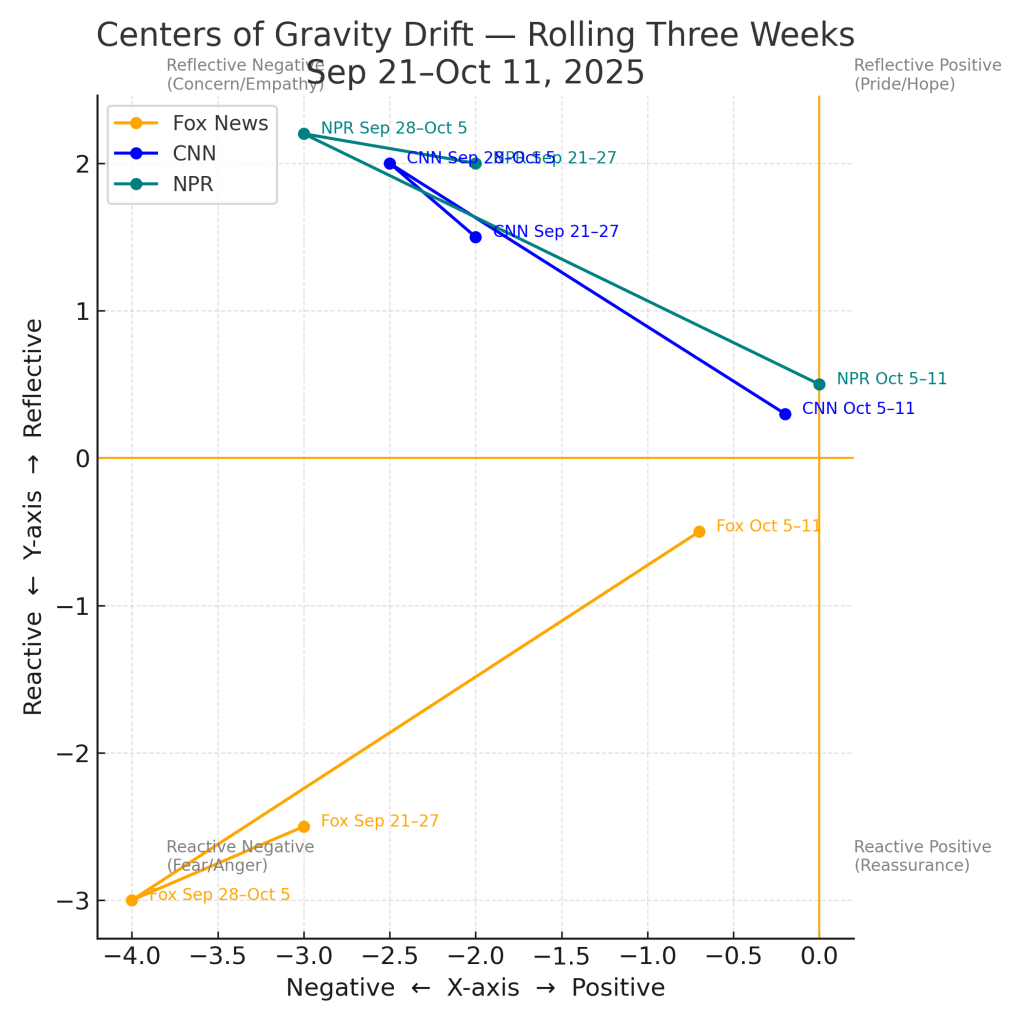 Beth: On the map, Fox stayed most negative‑reactive but drifted slightly toward pride/reassurance because Gaza coverage let them claim a diplomatic win. CNN held a steady line in reflective concern. NPR stayed the most reflective and analytic, though more concerned than last week.