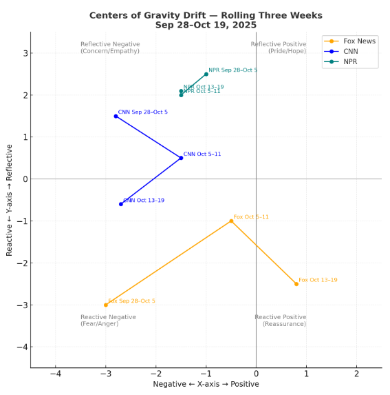 This week’s analysis integrates Gemini’s quantitative scoring with Grok’s narrative context to map the emotional tone of Fox News, CNN, and NPR during the period of October 13–19, 2025.