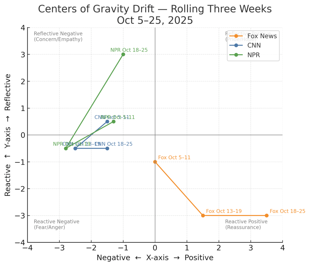 Beth: Exactly. Fox turned anger into purpose — their audience isn’t meant to feel despair, they’re meant to feel righteous endurance. CNN, meanwhile, blended outrage with empathy — almost a call to moral action. And NPR? They leaned into the long-view sadness of institutional decay.